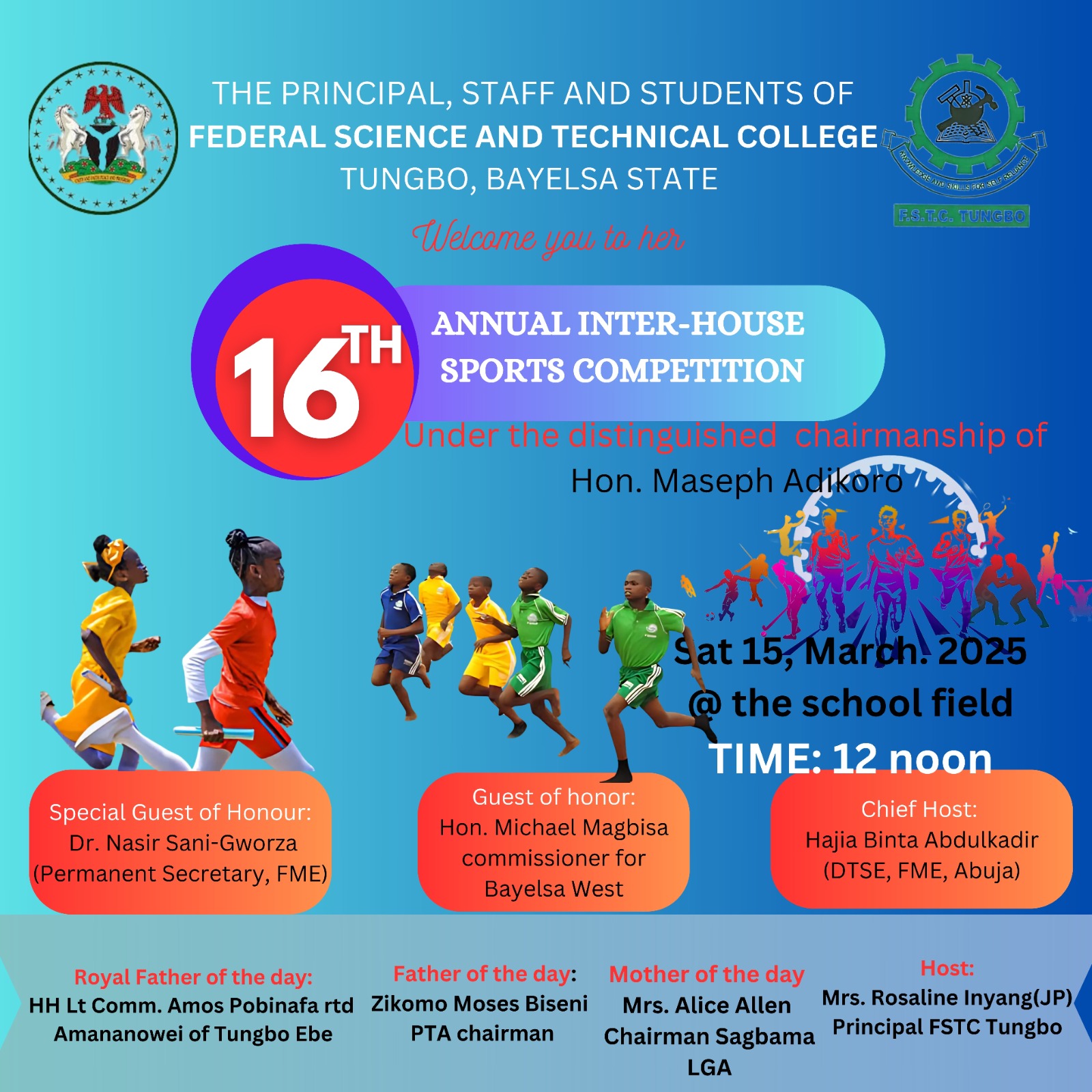 Tungbo, Bayelsa State – March 15, 2025 – The atmosphere at Federal Science and Technical College (FSTC) Tungbo was electric today as the school successfully hosted its 16th Annual Inter-House Sports Competition. The event, a vibrant display of athleticism, teamwork, and school spirit, brought together students, staff, parents, and esteemed guests for a memorable day of sporting excellence.